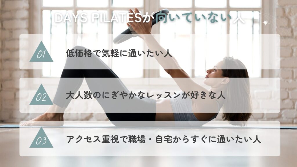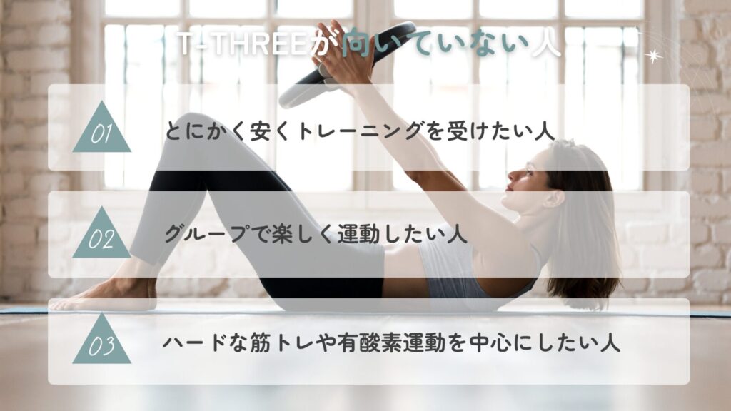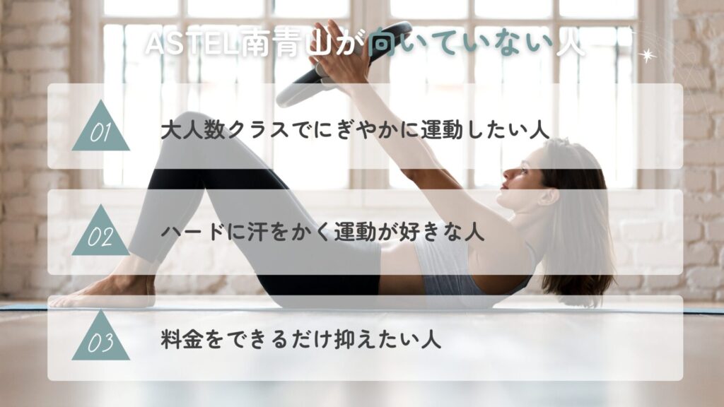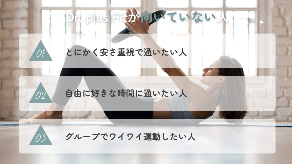 一方で、Dr.ピラティスの特徴やサービス内容を考えると、あまり相性が良くない場合もあります。ここでは、注意したい人のタイプを3つ紹介します。