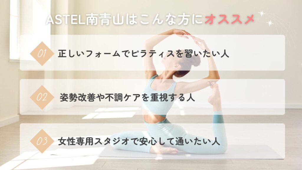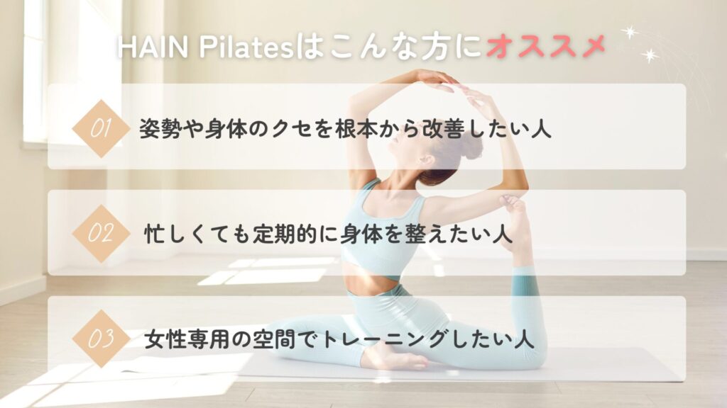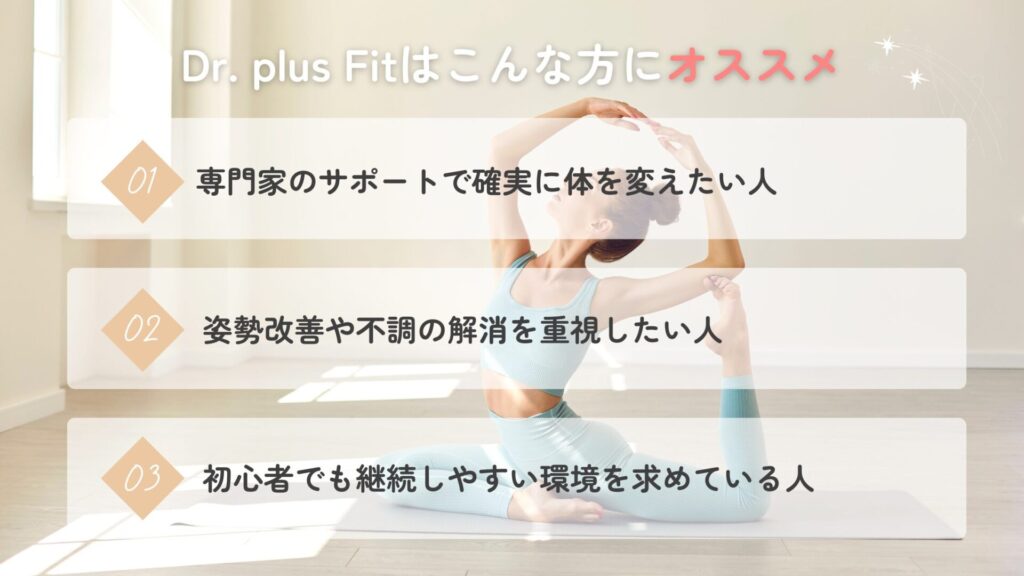 Dr.ピラティスは、姿勢改善や身体の機能向上に特化したスタジオのため、特に相性の良いタイプの利用者が存在します。ここでは、通うメリットが大きい人の特徴を3つ紹介します。