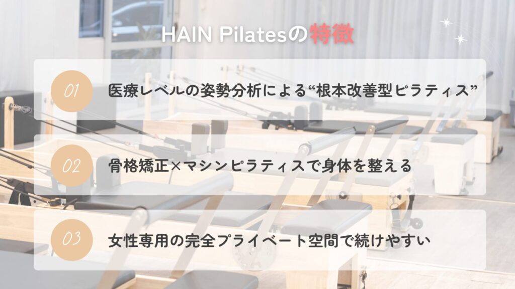 Dr.ピラティスは、「医療 × ピラティス × トレーニング」を掛け合わせ、姿勢・機能改善に特化したピラティススタジオです。体の不調や姿勢の癖を根本から整えるメソッドが評価され、初心者から本格改善を求める利用者まで幅広く選ばれています。ここでは、特に利用者から高く評価されている特徴を3つにまとめて紹介します。