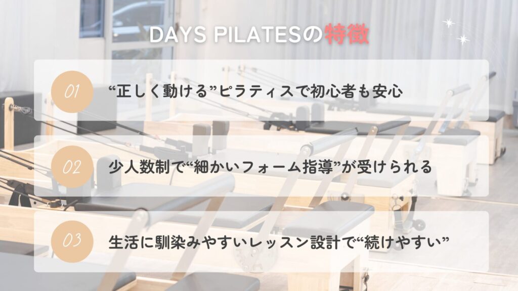ピラティスは“正しいフォームで動けるかどうか”で効果が大きく変わるため、指導者が近い距離で見てくれることは重要です。清潔で通いやすい環境は継続にも直結します。