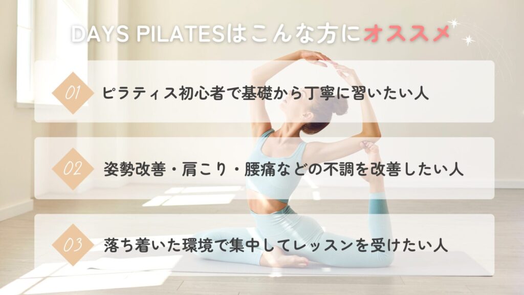 環境要因は集中力と継続力に直結します。落ち着いた空間は身体感覚に意識を向けやすく、ピラティスの効果を引き出しやすいです。