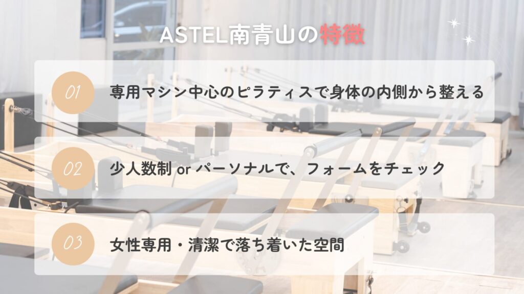 トレーナーが姿勢や骨格のバランスを詳細に分析し、その結果をもとに「必要な筋肉を使う」「使いすぎている部位をリリースする」といった個別メニューを構成します。マシンピラティスを中心に、自分の身体に合わせて安全かつ効果的に動ける点が高く評価されています。