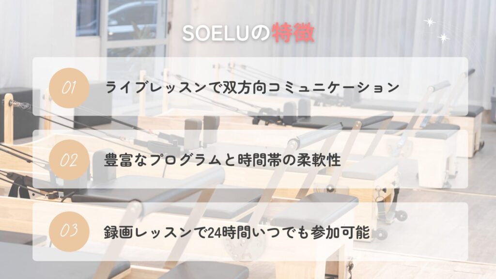 そんなオンラインフィットネスSOELUには、以下のような魅力的な特徴があります。