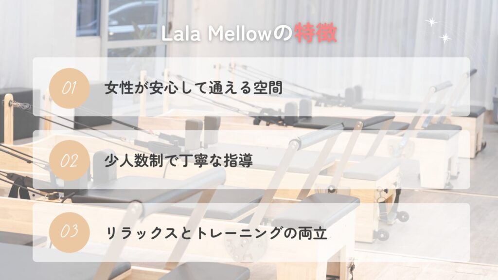 Lala Mellowは、落ち着いた空間と少人数制の丁寧なレッスンを通して、心と体の両方を整えられるスタジオです。女性が安心して通える環境や、初心者でも安心できる指導スタイルが多くの支持を集めています。
