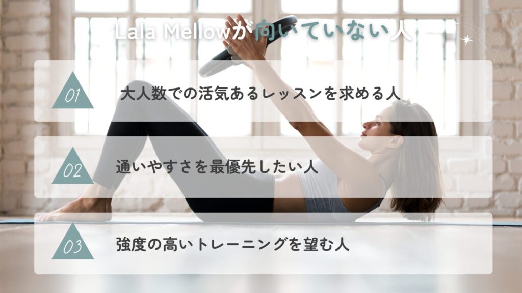 Lala Mellowは、落ち着いた雰囲気の中で心身を整えたい人に最適なスタジオですが、すべての人に合うわけではありません。利用スタイルや目的によっては、他のスタジオやサービスの方がフィットする場合もあります。
