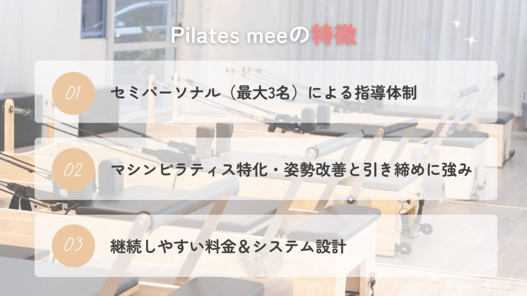 Pilates Meeは、「少人数制で丁寧に見てもらいたい」「無理なく継続できる環境で体を整えたい」という方にぴったりのマシンピラティススタジオです。最大3名のセミパーソナル形式により、インストラクターの目が届く中で一人ひとりに寄り添った指導が受けられます。