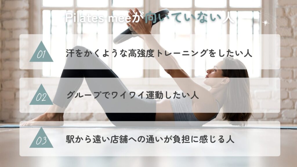 Pilates Meeは姿勢改善や体幹強化が中心で、心拍数を大きく上げる運動ではありません。燃焼系や筋肥大を目的とする方には物足りない場合があります。