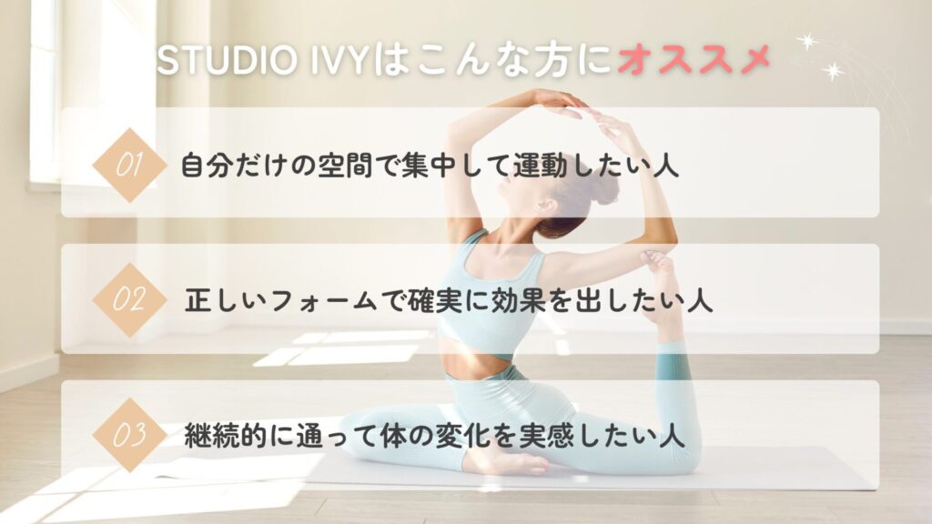 STUDIO IVYは、完全個室のパーソナル空間でじっくり体を整えたい人にぴったりのスタジオです。姿勢改善・ボディメイク・健康維持といった幅広い目的に対応できる柔軟さがあり、「質の高いトレーニングを求める人」から高い支持を得ています。