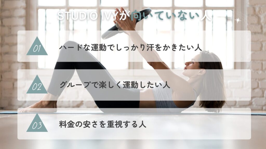 一方で、STUDIO IVYは“丁寧に体を整えるスタジオ”のため、目的や好みによっては他のスタイルの方が合う場合もあります。以下のようなタイプの方には、別の選択肢を検討するのもおすすめです。