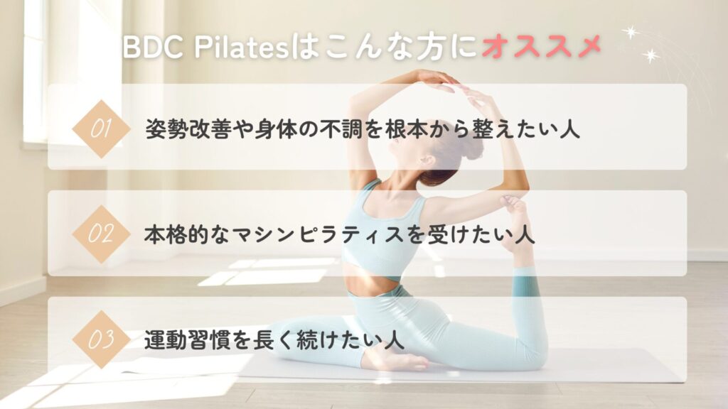 BDC Pilatesは、ニューヨーク発のメソッドをベースに、解剖学的に裏付けられた本格的なマシンピラティスを提供するスタジオです。丁寧な指導と清潔な環境が整っているため、初心者からアスリートまで幅広く対応できるのが魅力です。ここでは、特におすすめしたい人のタイプを紹介します。