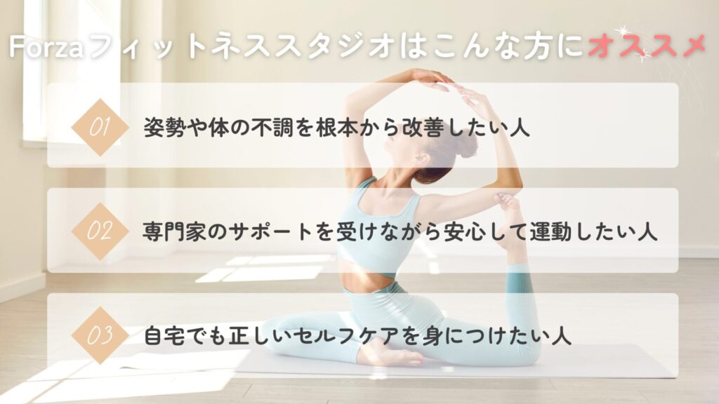 医学的視点を持つインストラクターによる評価と指導は、姿勢改善や慢性的な不調の根本ケアに非常に有効です。