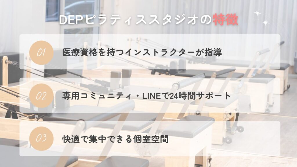 DEPピラティススタジオは、医学的知識を持つインストラクターによる本格的な指導と、安心して通える環境が特徴です。