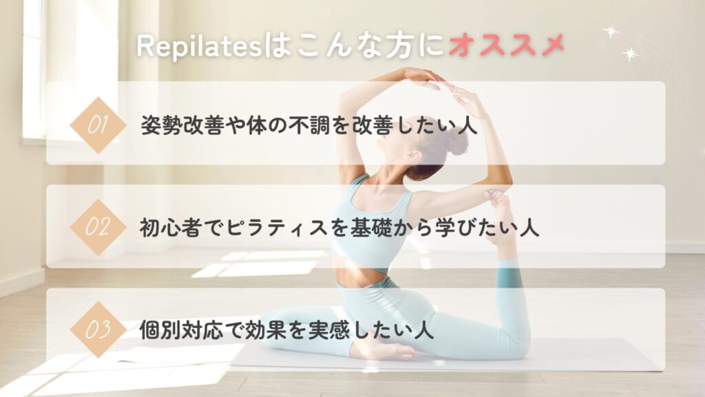 総じて、Repilatesは 姿勢改善や体の不調を整えたい人、基礎から丁寧に学びたい初心者、そして効果を実感しながら継続したい人 におすすめできるスタジオです。まずは体験レッスンで、自分に合ったスタイルかどうかを試してみると良いでしょう。