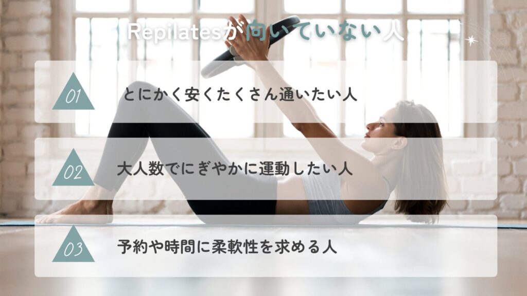 Repilatesは、少人数制やパーソナル対応で丁寧な指導が受けられる人気スタジオですが、すべての人に最適とは限りません。ライフスタイルや目的によっては、別のスタジオのほうが合う場合もあります。ここでは、Repilatesが向いていない可能性がある人の特徴を整理しました。
