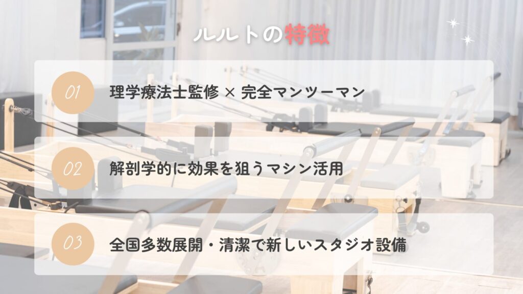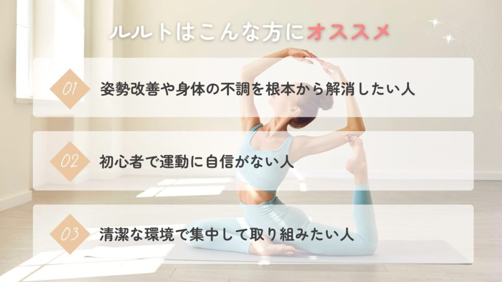 ルルトは、理学療法士監修のマンツーマンプログラムで「根本から身体を変える」ことを目指すスタジオです。医学的な視点に基づいた丁寧な指導や清潔感ある空間は、多くの利用者から高い支持を集めています。特に次のような方におすすめです。