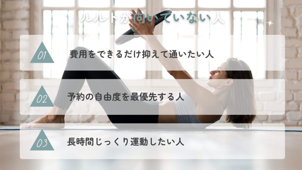 一方で、ルルトの特徴である「完全マンツーマン」「予約制」「専門性の高さ」は、人によっては合わない場合もあります。スタジオ選びの参考になるよう、向いていない可能性がある人のタイプも整理しました。